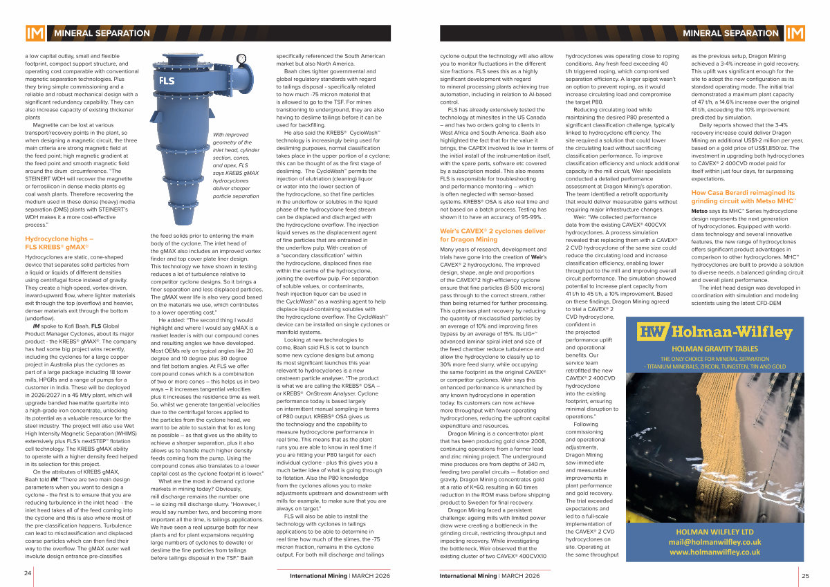 IM spoke to Kofi Baah, FLS Global Product Manager Cyclones, about its major product- the KREBS ® gMAX ®. The company has had some big project wins recently, including the cyclones for a large copper project in Australia plus the cyclones as part of a large package including 18 tower mills, HPGRs and a range of pumps for a customer in India. These will be deployed in 2026 / 2027 in a 45 Mt / y plant, which will upgrade banded haematite quartzite into a high-grade iron concentrate, unlocking its potential as a valuable resource for the steel industry. The project will also use Wet High Intensity Magnetic Separation( WHIMS) extensively plus FLS’ s nextSTEP™ flotation cell technology. The KREBS gMAX ability to operate with a higher density feed helped in its selection for this project.