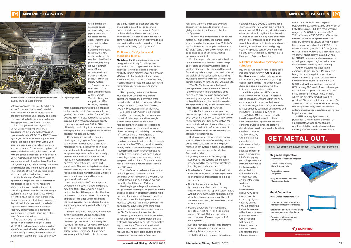 On latest Metso MHC™ Hydrocyclone development, it says the new, unique and patented MHC™ Hydrocyclone curved bottom is a breakthrough for classification processes. It offers increased unit capacity and coarser cut sizes whilst minimising the fines bypass. The new design helps in significantly improving overall efficiency of the solution.
