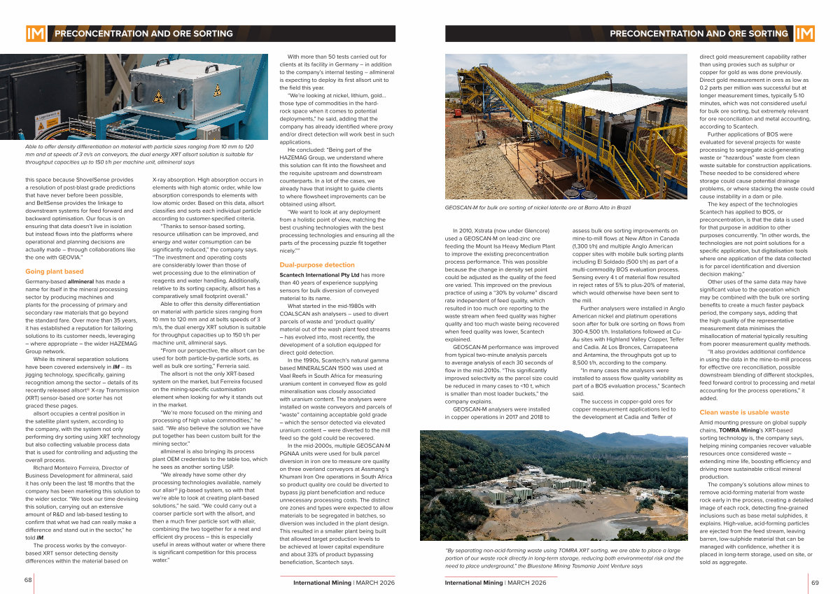 X-ray absorption. High absorption occurs in elements with high atomic order, while low absorption corresponds to elements with low atomic order. Based on this data, allsort classifies and sorts each individual particle according to customer-specified criteria.“ Thanks to sensor-based sorting, resource utilisation can be improved, and energy and water consumption can be significantly reduced,” the company says.“ The investment and operating costs are considerably lower than those of wet processing due to the elimination of reagents and water handling. Additionally, relative to its sorting capacity, allsort has a comparatively small footprint overall.”