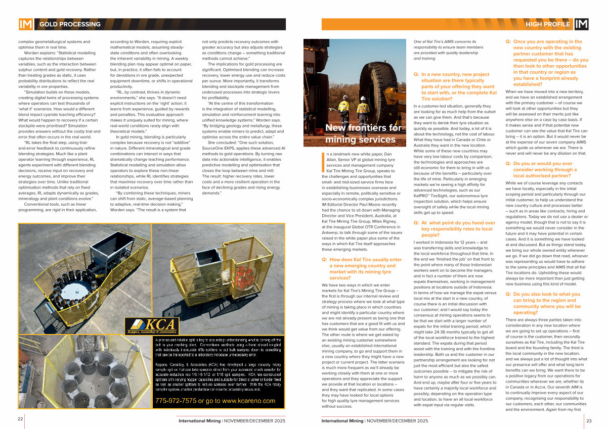 She concluded:“ One such solution, SourceOne EKPS, applies these advanced AI methods to gold operations. By turning raw data into actionable intelligence, it enables predictive modelling and optimisation that closes the loop between mine and mill. The result: higher recovery rates, lower costs and a more resilient operation in the face of declining grades and rising energy demands.” 22 International Mining | NOVEMBER / DECEMBER 2025