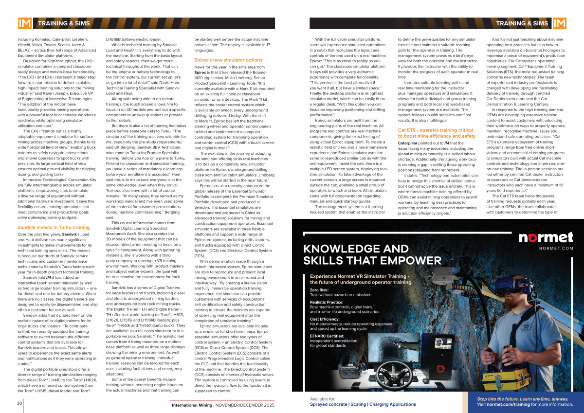 In response to the high training demand, OEMs are developing extensive training content to assist customers with educating their workforce on ways to properly operate, maintain, recognise machine issues and understand safe operating practices.“ Cat ETS’ s extensive ecosystem of training programs range from free online short videos and economical eLearning programs to simulators built with actual Cat machine controls and technology and in-person, oneon-one training. The in-person sessions are led either by certified Cat dealer instructors or operators or Cat demonstration instructors who each have a minimum of 10 years field experience.”