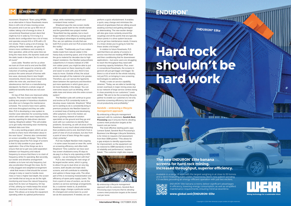 The NexGen suite will continue to grow and evolve as FLS consistently looks to develop newer materials. Shepherd:“ What we’ re wanting to do is consistently bring in premium products into NexGen based on a constant loop of testing and developing other polymers. Out in the market, we have a growing network of solution specialists on the ground and they go and work with our customers to identify their problems. Screening, as with all areas of the flowsheet, is very much about understanding their problems end to end. And that’ s from a point of view of circuit analysis, but also from a point of view of basic things like supply chain certainty.”