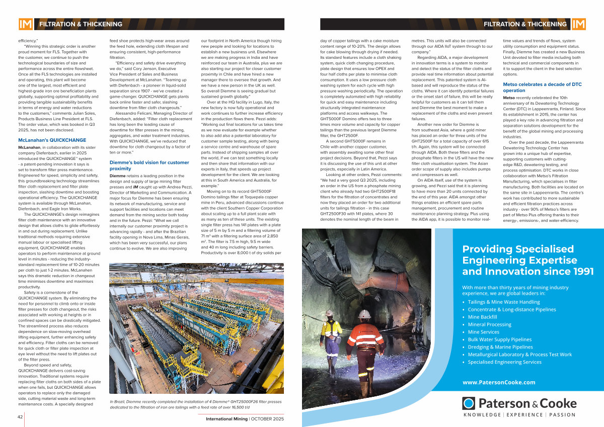 Diemme retains a leading position in the design and supply of large mining filter presses and IM caught up with Andrea Pezzi, Director of Marketing and Communication. A major focus for Diemme has been ensuring its network of manufacturing, service and support facilities and locations can meet demand from the mining sector both today and in the future. Pezzi:“ What we call internally our customer proximity project is advancing rapidly- and after the Brazilian facility opening in Nova Lima, Minas Gerais, which has been very successful, our plans continue to evolve. We are also improving our footprint in North America though hiring new people and looking for locations to establish a new business unit. Elsewhere we are making progress in India and have reinforced our team in Australia, plus we are also starting our project for closer customer proximity in Chile and have hired a new manager there to oversee that growth. And we have a new person in the UK as well. So overall Diemme is seeing gradual but sustained growth globally.”