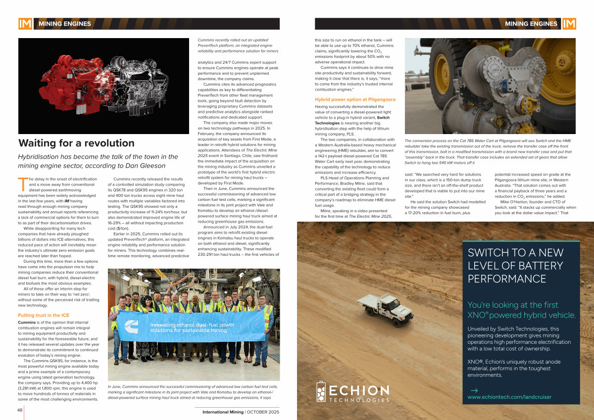 The company also made major moves on two technology pathways in 2025. In February, the company announced its acquisition of key assets from First Mode, a leader in retrofit hybrid solutions for mining applications. Attendees of The Electric Mine 2025 event in Santiago, Chile, saw firsthand the immediate impact of the acquisition on the mining industry as Cummins unveiled a prototype of the world’ s first hybrid electric retrofit system for mining haul trucks – developed by First Mode.