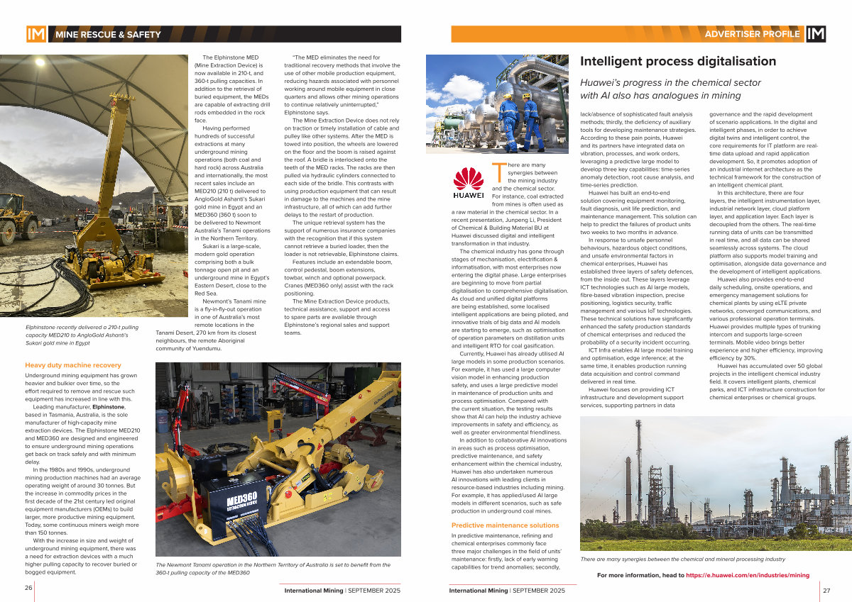 Having performed hundreds of successful extractions at many underground mining operations( both coal and hard rock) across Australia and internationally, the most recent sales include an MED210( 210 t) delivered to AngloGold Ashanti’ s Sukari gold mine in Egypt and an MED360( 360 t) soon to be delivered to Newmont Australia’ s Tanami operations in the Northern Territory.