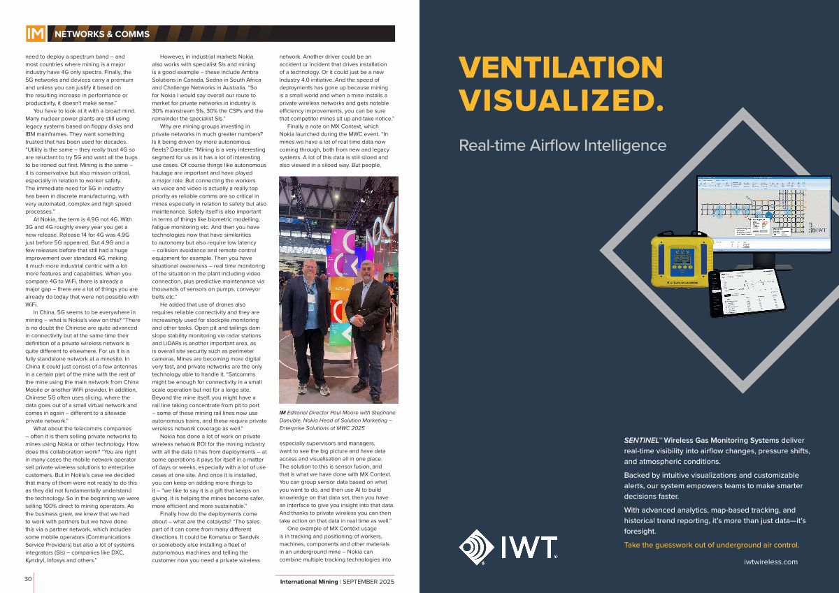 network. Another driver could be an accident or incident that drives installation of a technology. Or it could just be a new Industry 4.0 initiative. And the speed of deployments has gone up because mining is a small world and when a mine installs a private wireless networks and gets notable efficiency improvements, you can be sure that competitor mines sit up and take notice.”