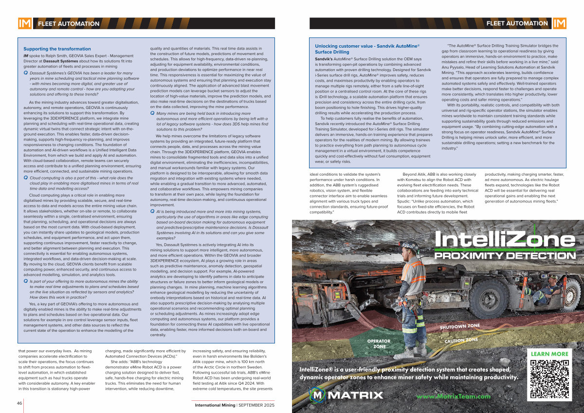 Sandvik’ s AutoMine ® Surface Drilling solution the OEM says is transforming open-pit operations by combining advanced automation with proven drilling technology. Designed for Sandvik i-Series surface drill rigs, AutoMine ® improves safety, reduces costs, and maximises productivity by enabling operators to manage multiple rigs remotely, either from a safe line-of-sight position or a centralised control room. At the core of these rigs is iDrill technology, a scalable automation platform that ensures precision and consistency across the entire drilling cycle, from boom positioning to hole finishing. This drives higher-quality drilling results while accelerating the production process.