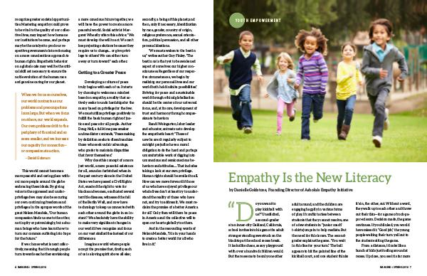 recognize greater societal opportuni- ties. Mastering empathy could prove to be vital to the quality of our collec- tive lives, may impact how humane our institutions become, and perhaps may be the catalyst to prod our re- spective governments into refocusing on a more conscientious approach to human rights. Empathetic behavior on a global scale may well be the criti- cal skill set necessary to ensure the noble evolution of the human race and genuine caring for our planet. When we focus on ourselves, our world contracts as our problems and preoccupations loom large. But when we focus on others, our world expands. Our own problems drift to the periphery of the mind and so seem smaller, and we increase our capacity for connection— or compassionate action. - Daniel Goleman This world cannot become a more peaceful and caring place with- out more people around the globe embracing these ideals. By giving voice to the oppressed and under- privileged we may also be securing our own continuing freedoms and privileges. In the apropos words of the great Nelson Mandela, “Our human compassion binds us one to the other, not in pity or patronizingly, but as hu- man beings who have learnt how to turn our common suffering into hope for the future.” If we choose what is next collec- tively, meaning that if enough people turn towards each other envisioning 6 IMAGINE l SPRING 2016 a more conscious future together, we will have the power to create a more peaceful world. Social activist Mar- garet Wheatly offers this advice: “We must develop the will to act. We can’t keep rejecting solutions because they require us to change… or give privi- lege to others! We can either turn away or turn toward” each other. Getting to a Greater Peace Developing a culture of peace truly begins with each of us. It starts by choosing to welcome a mindset based on empathy, a reality that ac- tively seeks to undo hardships for the many based on privilege for the few. We must utilize privilege positively to fulfill the basic human rights of jus- tice and peace for all people. Author Doug Noll, a full-time peacemaker and mediator contends, “Peacemaking by definition seeks to disenfranchise those who seek unfair advantage, who prefer to maintain disparities that favor themselves.” Why does this concept of a more just world, a more peaceful existence for all, sound so farfetched when in the past century alone in the United States we have passed a Civil Rights Act, enacted the right to vote for blacks and women, eradicated several terrible diseases, witnessed the fall of the Berlin Wall, and now have technology to keep us connected with each other around the globe in an in- stant? We absolutely have the ability to make very significant changes in our world if we recognize and focus on our vast similarities instead of our differences. Imagine a world where people accept the premise that, firstly, each of us is a loving spirit above all else; secondly, a being of this planet; and then, only if necessary, identification by race, gender, country of origin, religious preference, sexual orienta- tion, political persuasion, and all other personal ideations. “We must awaken to the best in us,” writes author Guy Finley. “The best in us is that yet to be awakened aspect of ourselves: our higher con- sciousness. Regardless of our respec- tive circumstances, we begin by realizing our personal lives and our world both hold infinite possibilities.” Striving for peace and a sustainable world through ethical globalization should be the center of our universal focus, and, at its core, development of trust and harmony through compas- sionate behaviors. Randi Weingarten, labor leader and educator, entreats us to develop the empathetic heart: ”Those of us who aren’t regularly subject to outright prejudice have a moral obligation to do the hard and perhaps uncomfortable work of digging into unconscious and semiconscious be- haviors and attitudes…. That includes taking a look at our own privilege. Human rights should be availed to all. How can we move forward if those of us who have enjoyed privilege our whole lives don’t at least try to under- stand the reality of those who have not, and try to address it. We must re- claim the promise of a better America for all.” Only then will there be peace in America and the collective will to open our hearts globally to others. And in the resounding words of Nelson Mandela, “It is in your hands to create a better world for all who live in it.”