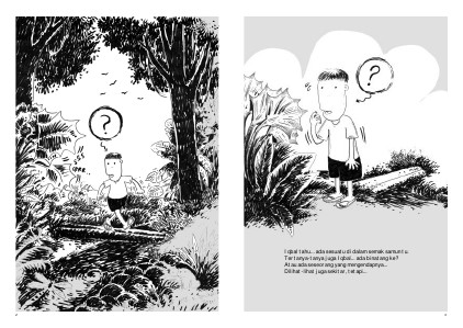 Iqbal tahu... ada sesuatu di dalam semak samun tu. Tertanya-tanya juga Iqbal... ada binatang ke? Atau ada seseorang yang mengendapnya... Dilihat-lihat juga sekitar, tetapi...