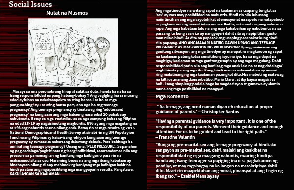 “Bunga ng pre-marital sex ang teenage pregnancy at hindi ako sangayon sa pre-marital sex, dahil malaki ang kaakibat na responsibilidad ng mga maagang nabuntis, maaring hindi pa handa ang isang teen ager sa pagiging ina o sa pagkakaroon ng pamilya, at may mga bagay na kailangan na masakripisyo dahil dito. Maari rin maapektuhan ang moral, pinansyal at ang tingin ng ibang tao.” – Ezekiel Manalaysay