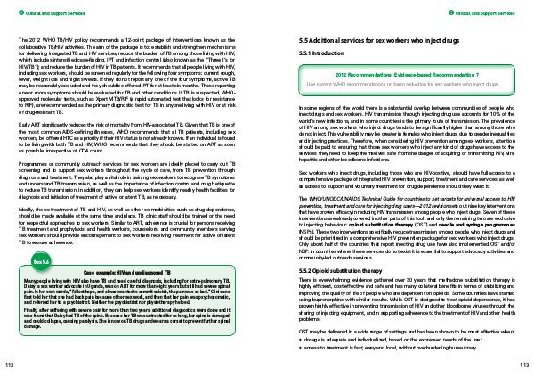 The 2012 WHO TB / HIV policy recommends a 12-point package of interventions known as the collaborative TB / HIV activities. The aim of the package is to: establish and strengthen mechanisms for delivering integrated TB and HIV services; reduce the burden of TB among those living with HIV, which includes intensified case-finding, IPT and infection control( also known as the“ Three I’ s for HIV / TB”); and reduce the burden of HIV in TB patients. It recommends that all people living with HIV, including sex workers, should be screened regularly for the following four symptoms: current cough, fever, weight loss and night sweats. If they do not report any one of the four symptoms, active TB may be reasonably excluded and they should be offered IPT for at least six months. Those reporting one or more symptoms should be evaluated for TB and other conditions. If TB is suspected, WHOapproved molecular tests, such as Xpert MTB / RIF( a rapid automated test that looks for resistance to RIF), are recommended as the primary diagnostic test for TB in anyone living with HIV or at risk of drug-resistant TB.