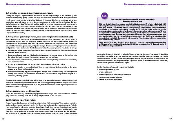 Programme implementation in this stage is a matter of strengthening systems, addressing structural barriers and empowering communities while simultaneously providing and measuring services. Some of the earlier intensive programme activities may be reduced as social norms regarding condom use and clinical service use change.