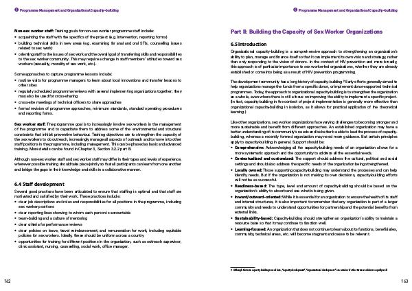 Organizational capacity-building is a comprehensive approach to strengthening an organization’ s ability to plan, manage and finance itself so that it can implement its own vision and strategy, rather than only responding to the vision of donors. In the context of HIV prevention and more broadly, this approach is of particular importance to sex worker-led organizations, whether they are already established or come into being as a result of HIV prevention programming.
