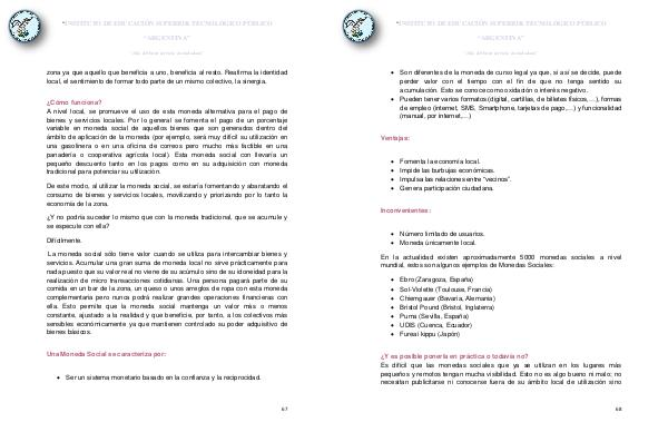 ¿ Cómo funciona? A nivel local, se promueve el uso de esta moneda alternativa para el pago de bienes y servicios locales. Por lo general se fomenta el pago de un porcentaje variable en moneda social de aquellos bienes que son generados dentro del ámbito de aplicación de la moneda( por ejemplo, será muy difícil su utilización en una gasolinera o en una oficina de correos pero mucho más factible en una panadería o cooperativa agrícola local). Esta moneda social con llevaría un pequeño descuento tanto en los pagos como en su adquisición con moneda tradicional para potenciar su utilización.