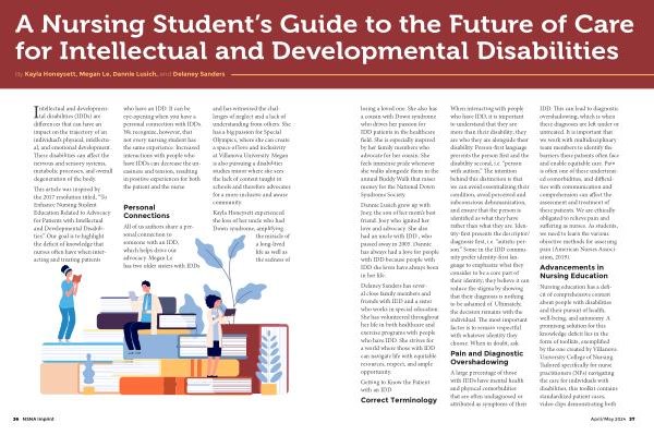 This article was inspired by the 2017 resolution titled , “ To Enhance Nursing Student Education Related to Advocacy for Patients with Intellectual and Developmental Disabilities .” Our goal is to highlight the deficit of knowledge that nurses often have when interacting and treating patients who have an IDD . It can be eye-opening when you have a personal connection with IDDs . We recognize , however , that not every nursing student has the same experience . Increased interactions with people who have IDDs can decrease the uneasiness and tension , resulting in positive experiences for both the patient and the nurse .