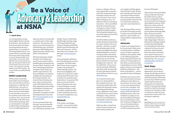 26 NSNA Imprint shape your future in nursing, both as a student and as a future registered nurse. The experience will expose you to diverse perspectives and leadership styles, and shared governance while building meaningful connections with peers and leaders in the profession.