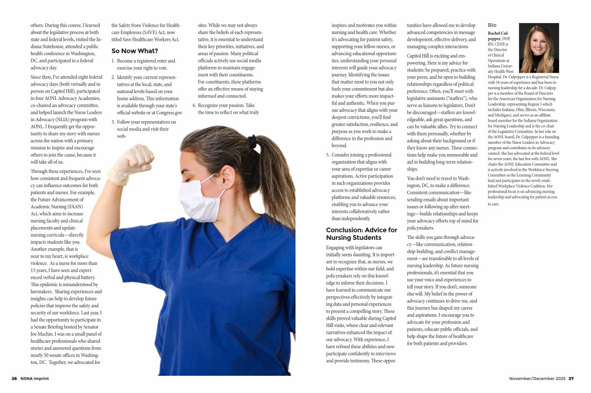 Since then, I’ ve attended eight federal advocacy days( both virtually and in person on Capitol Hill), participated in four AONL Advocacy Academies, co-chaired an advocacy committee, and helped launch the Nurse Leaders in Advocacy( NLIA) program with AONL. I frequently get the opportunity to share my story with nurses across the nation with a primary mission to inspire and encourage others to join the cause, because it will take all of us.