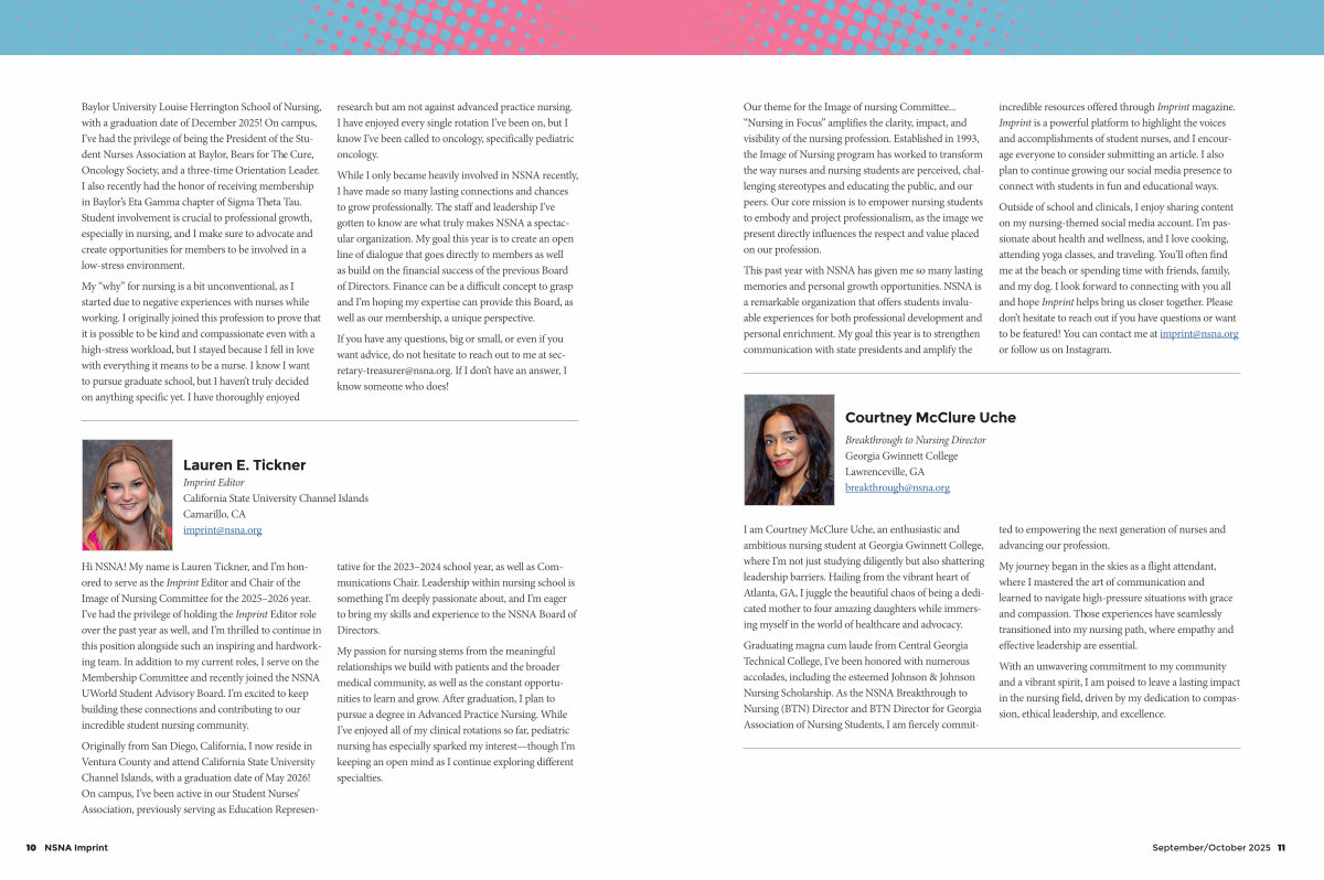 incredible resources offered through Imprint magazine. Imprint is a powerful platform to highlight the voices and accomplishments of student nurses, and I encourage everyone to consider submitting an article. I also plan to continue growing our social media presence to connect with students in fun and educational ways.