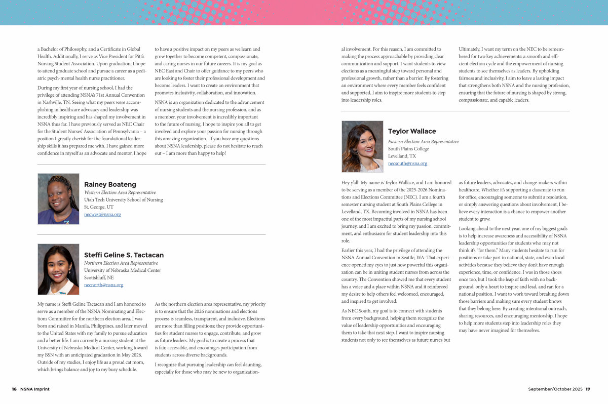 to have a positive impact on my peers as we learn and grow together to become competent, compassionate, and caring nurses in our future careers. It is my goal as NEC East and Chair to offer guidance to my peers who are looking to foster their professional development and become leaders. I want to create an environment that promotes inclusivity, collaboration, and innovation.