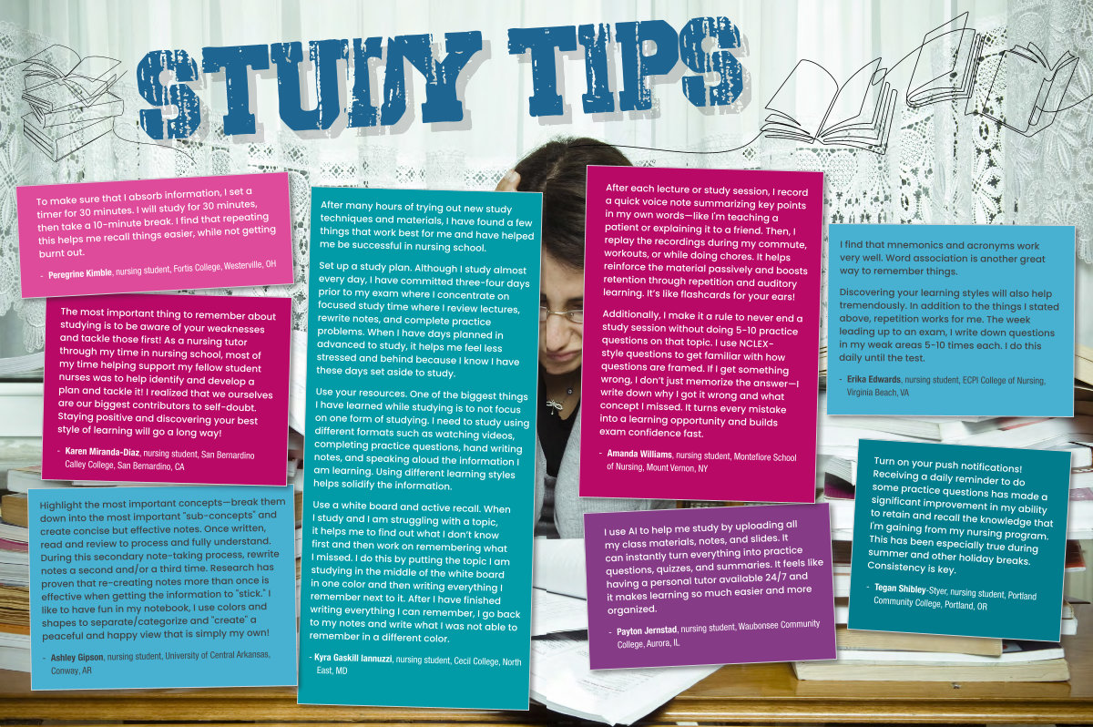 The most important thing to remember about studying is to be aware of your weaknesses and tackle those first! As a nursing tutor through my time in nursing school, most of my time helping support my fellow student nurses was to help identify and develop a plan and tackle it! I realized that we ourselves are our biggest contributors to self-doubt. Staying positive and discovering your best style of learning will go a long way!