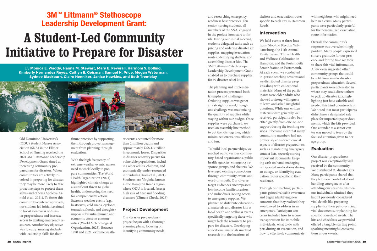 Old Dominion University’ s( ODU) Student Nurses Association( SNA) in the Ellmer School of Nursing received the 2024 3M™ Littmann ® Leadership Development Grant aimed at increasing community preparedness for disasters. When communities are actively involved in preparing for disaster, they may be more likely to take proactive steps to protect themselves and others( Appleby-Arnold et al., 2021). To foster this community-centered approach, our student-led initiative aimed to boost awareness of disaster preparedness and increase access to existing emergency resources. Another key objective was to equip nursing students with leadership skills for their future practices by supporting them through project management from planning through evaluation.