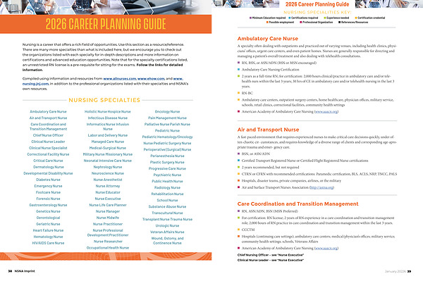 Nursing is a career that offers a rich field of opportunities. Use this section as a resource / reference. There are many more specialties than what is included here, but we encourage you to check out the organizations listed with each specialty for in-depth descriptions and more information on certifications and advanced education opportunities. Note that for the specialty certifications listed, an unrestricted RN license is a pre-requisite for sitting for the exams. Follow the links for detailed information.