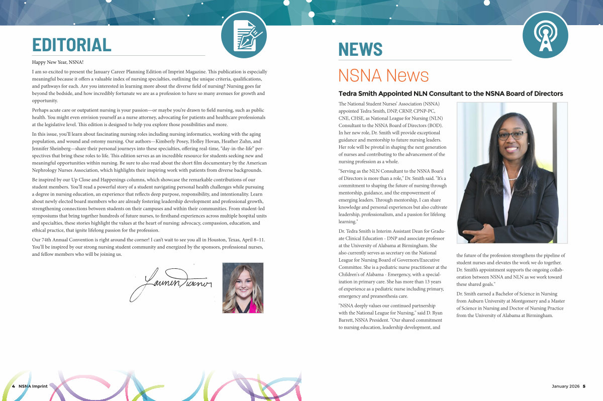 I am so excited to present the January Career Planning Edition of Imprint Magazine. This publication is especially meaningful because it offers a valuable index of nursing specialties, outlining the unique criteria, qualifications, and pathways for each. Are you interested in learning more about the diverse field of nursing? Nursing goes far beyond the bedside, and how incredibly fortunate we are as a profession to have so many avenues for growth and opportunity.