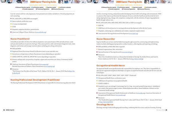NURSING SPECIALITIES KEY: n Minimum Education required n Certifications required n Experience needed n Certification credential n Possible employment n Professional Organization n References / Resources