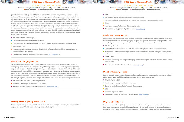 NURSING SPECIALITIES KEY: n Minimum Education required n Certifications required n Experience needed n Certification credential n Possible employment n Professional Organization n References / Resources n BSN n Certified Nurse Operating Room( CNOR) certification exam n Recommended experience in critical care and ER and continuing education in related fields n CNOR n Hospitals, physicians’ offices, ambulatory surgical units n Association of periOperative Registered Nurses( www. aorn. org)