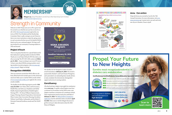 Welcome to 2026! I hope your year is off to a great start. I’ m excited to see what this new year has in store for us all. As the 74th Annual Convention approaches, my term as NSNA Vice President and the Membership Committee Chair is sadly coming to an end. However, that is even more motivation to make this spring semester and convention the best one yet! On behalf of NSNA, thank you for your continued support. We hope you ' ll stay involved in our community of nursing students in 2026 and beyond.