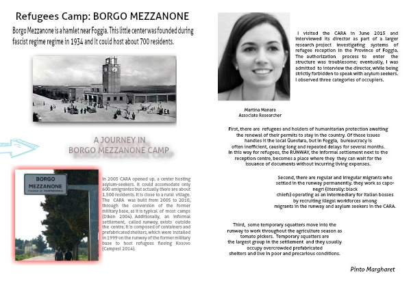 I visited the CARA in June 2015 and interviewed its director as part of a larger research project investigating systems of refugee reception in the Province of Foggia. The authorization process to enter the structure was troublesome; eventually, I was admitted to interview the director, while being strictly forbidden to speak with asylum seekers.