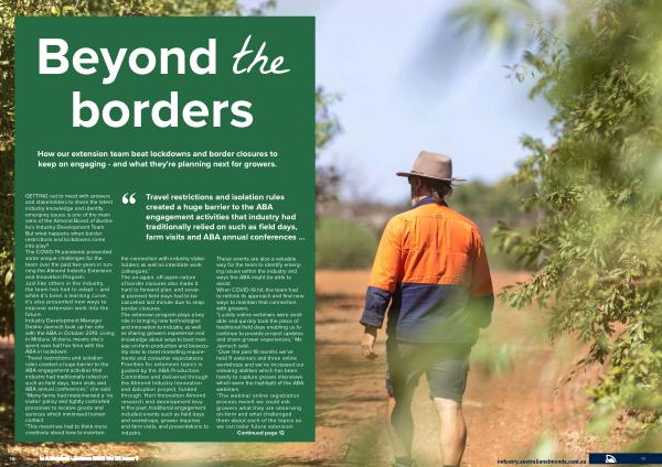 the connection with industry stakeholders as well as interstate work colleagues .” The on-again , off-again nature of border closures also made it hard to forward plan , and several planned field days had to be cancelled last minute due to snap border closures . The extension program plays a key role in bringing new technologies and innovation to industry , as well as sharing growers experience and knowledge about ways to best manage on-farm production and biosecurity risks to meet marketing requirements and consumer expectations . Priorities for extension topics is guided by the ABA Production Committee and delivered through the Almond Industry Innovation and Adoption project , funded through Hort Innovation Almond research and development levy . In the past , traditional engagement included events such as field days and workshops , grower inquiries and farm visits , and presentations to industry .