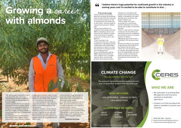 “ Getting out and talking with people in the industry has been helpful in identifying and understanding some of its key challenges ,” Rajesh said . “ That includes the issues presented by a wet harvest and the challenges of on-farm drying and storage of harvested almonds . " There ’ s a real need to continue to improve the harvesting and collecting machinery available to the industry to work in uncertain weather conditions . “ Managing input costs is also a challenge in this growing industry .” Despite that , Rajesh sees plenty of opportunity and potential for the industry into the future . “ There are a lot of opportunities for industry development in the areas of sustainability , new technology , remote monitoring for pests and diseases and waste management and recycling ,” he said .