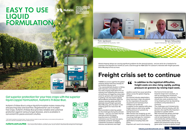 Global shipping delays are causing significant problems for the almond industry - and are set to be a headache for importers and exporters for months to come . Click through for ABA CEO Tim Jackson ' s interview with freight specialist Brian Mousley to find out more .
