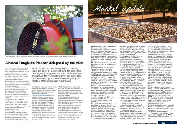 ( It is worth nothing that there is growing speculation that the bulk of the carryover will be made of lower grade and less sought after varieties which might not impact the Australia premium export offerings as first thought .) The plant based food phenomenon continues to drive demand in established markets for all things almonds , but sellers are frustrated by their inability to meet any type of pent up demand due to their inability to move stock promptly . A missed sales opportunity is never recovered . The next major event on the global market will be the May Subjective Estimate for the 2022 California almond crop . Another three billion plus pound prediction could soften the market as buyers ease concerns around availability and use the unprecedented size of the 2021 season carry-out to justify their buying activities . The recent USDA position reports for California almonds confirm sales volumes season to date are well behind previous years . In contrast the Australia almond industry has leveraged its free trade agreement with China to post record export sales for 2021-22 . The industry has sold to 45 countries during the year , but the direct shipping services to China and the premium price has been a critical factor in sales strategies from Down Under . Increased input costs , higher freight charges and lower global market prices have clearly been key considerations in sales strategies during the past season . Houston-based independent global almond market analyst , Stratamarkets , has reported there is unprecedented interest to shipping containers overseas without confirmed sales . The uncertainty of arrival times and the new mentality around securing stock “ just in case ” has resulted in more Californian sellers negotiating sales once stock is on the water or arrived in key markets like Europe . Stratamarkets ’ latest report suggest spot pricing for stock readily available was proving an attractive incentive for sending unsold containers into key markets . This is not a new practice for various trading houses , it now has become an option for even the more risk-averse marketers looking to clear stock in a timely manner and with a potential premium . The biggest news on the Australian trade front is a new bilateral trade agreement with India that includes a 50 % reduction in tariffs on 34,000 tonnes of inshell and kernel products . After many years of negotiations , the tariff advantage will help the industry boost sales in a key market and make it more competitive against Californian product . Across the 2021-22 season almost 24,000 tonnes of product was exported to India , so the new 34,000 tonne quota provides room to grow . Meanwhile , the industry will continue to work with the Department of Foreign Affairs ( DFAT ) and Trade and the Department of Agriculture , Water and Environment ( DAWE ) to push for a total free trade agreement in the next round of negotiations with India . The details around the supply period for the new quota , how it will be managed and when it will come into play is yet to be announced . The ABA has been told by the Commonwealth that it will take until the last quarter of 2022 before the 50 % tariff reduction is officially written into law .