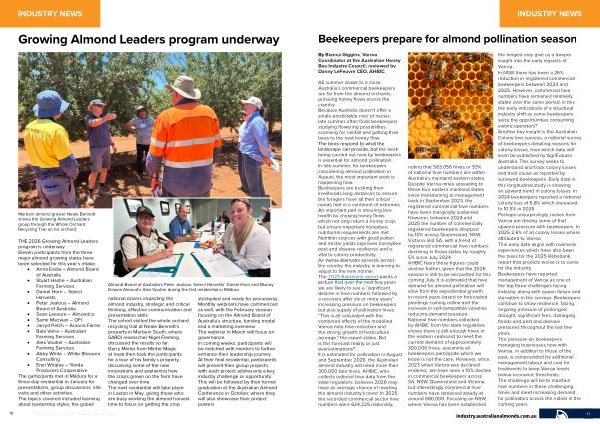 AS summer draws to a close, Australia’ s commercial beekeepers are far from the almond orchards, pursuing honey flows across the country. Because Australia doesn’ t offer a single predictable river of nectar, late summer often finds beekeepers studying flowering possibilities, scanning for rainfall and getting their bees to the next honey flow. The bees respond to what the landscape can provide, but the work being carried out now by beekeepers is essential for almond pollination. In late summer, for beekeepers considering almond pollination in August, the most important work is happening now. Beekeepers are trucking their livelihoods long distances to ensure the foragers have all their critical needs met in a continent of extremes. An important part is ensuring bee health by chasing honey flows which not only return a honey crop, but ensure important honeybee nutritional requirements are met. Nutrition sources with good pollen and nectar yields improves honeybee pest and disease resilience and is vital to colony productivity. As Varroa destructor spreads across the country the industry is learning to adjust to the new normal. The 2025 Rabobank report paints a picture that over the next few years we are likely to see a“ significant decline in hive numbers followed by a recovery after six or more years” increasing pressure on beekeepers but also supply of pollination hives.“ This is all calculated with the combined effects of the modelled Varroa mite hive reduction and the strong growth of horticulture acreage," the report states. But is this forecast reality or just overestimations? It is estimated for pollination in August and September 2026, the Australian almond industry will need more than 300,000 bee hives. AHBIC, who collects national hive data from the state regulators, believes 2026 may have an average chance of meeting the almond industry ' s need. In 2025 the recorded commercial sector hive numbers were 624,225 nationally,