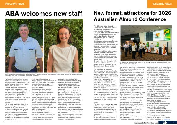 degree of FOMO( fear of missing out) by staging concurrent presentations across two stages. By placing downstream supply chain activities in a condensed program as a prequel to the official welcome, it is hoped that it can attract an extra demographic to the first day audience and maximise a holistic share of information across a more relaxed timeline. Almond Board of Australia CEO Tim Jackson said the conference format change was an attempt to be as inclusive as possible. Extra space has been booked to cater for a piazza-style trade exhibit floor plan that features networking and bar areas in the middle of the trade exhibits. A large screen will also show all the presentations from the plenary so those in the trade arena will always be aware of what is being discussed on the main stage. Almond Board of California CEO Clarice Turner will be among the keynote speakers at the conference. It will be Clarice’ s first appearance at the conference. The former Starbucks senior vice president is utilising her considerable business acumen to drive almond demand around the world despite the ongoing industry challenges faced both at home and abroad. She will headline in a worldclass line up of almond experts in a wide range of areas including increasing yields, tackling hull rot, phytophthora, varietal-rootstock combinations, gene editing, AI, pest management, carob moth, carpophilus beetle and maximising returns. Industry stakeholders are encouraged to register for the conference at the same time they take out their new 2026-27 ABA memberships. The membership discount, coupled with early bird registrations provide great value for money. Sponsorship and trade exhibit spaces are already filling up quickly, so those keen to be involved are recommended to book early. There are limited sponsorship opportunities left while more than half of the exhibit booths have also been taken. For more information on the conference, as well as sponsorship and exhibit opportunities, click here.