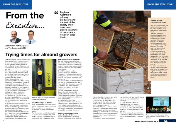 THE resilience of almond growers has been sorely tested in recent weeks. A week of extreme temperatures in late January were followed by rain in Sunraysia and Riverland that ended a long dry spell and stopped harvest. No sooner were growers restarting their shaking, than the ramifications of the war in the Middle East reached the farm gates as fuel and fertiliser supply came into doubt. Regional Australia ' s primary producers and the rest of the supply chain have been placed in a state of uncertainty not seen since Covid. The ABA has been representing the industry’ s interests through as many channels as possible to push the case for prioritisation of fuel supplies to include agriculture producers. The need for diesel has been accentuated by the need to dry product impacted by the earlier rains. Panic buying of fuel is being blamed for shortages in many parts of the country. In an online meeting convened by the NFF, a representative from Nutrien told more than 60 ag stakeholders that there was no guarantee of urea being available after May. He estimated that 70 % of Australia’ s urea is sourced from the Middle East. These potential shortfalls in supply have already spiked costs significantly and distributors are