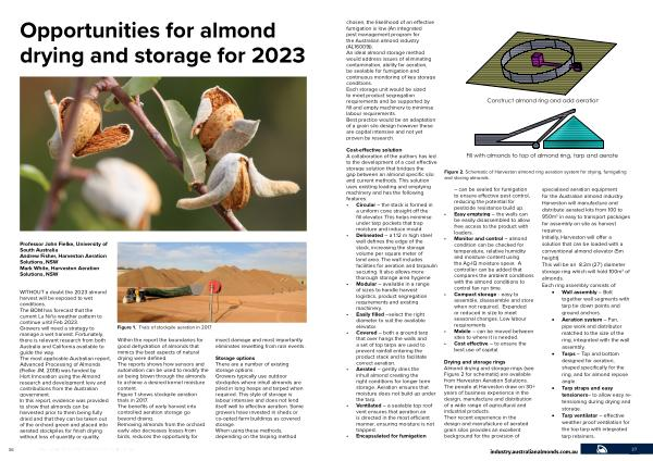 WITHOUT a doubt the 2023 almond harvest will be exposed to wet conditions . The BOM has forecast that the current La NiƱa weather pattern to continue until Feb 2023 . Growers will need a strategy to manage a wet harvest . Fortunately , there is relevant research from both Australia and California available to guide the way . The most applicable Australian report , Advanced Processing of Almonds ( Fielke JM , 2018 ) was funded by Hort Innovation using the Almond research and development levy and contributions from the Australian government . In this report , evidence was provided to show that almonds can be harvested prior to them being fully dried and that they can be taken out of the orchard green and placed into aerated stockpiles for finish drying without loss of quantity or quality .