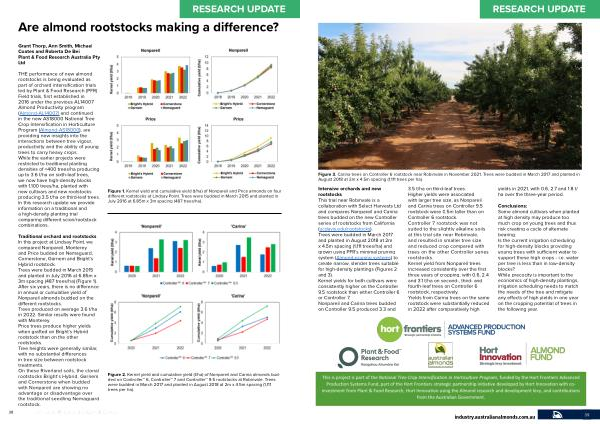 Intensive orchards and new rootstocks This trial near Robinvale is a collaboration with Select Harvests Ltd and compares Nonpareil and Carina trees budded on the new Controller series of rootstocks from California (