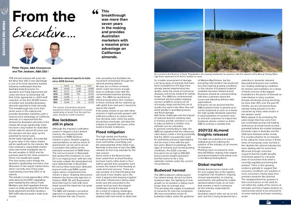 THE almond industry will jump into the New Year with a new advantage in one of its most important markets following confirmation that the Australia-India Economic Cooperation and Trade Agreement will come into force on December 29 . Part of this agreement is a 50 % tariff reduction on the first 34,000 tonnes of shelled and inshelled Australian almonds exported to India annually . This breakthrough was more than seven years in the making and provides Australian marketers with a massive price advantage on California almonds . It is expected that the demand for Australian almonds in this market will surge significantly . India has been a key market for Australian inshell sales for almost 20 years , but this decision will also open up the potential for kernel sales . As the table highlights , the potential to grow sales in the Indian market will be significant for the industry . We have retained a respectable market share but inshell availability due to the wet weather in 2022 and the premium paid for the same product in China , has weakened supply . This new quota could change the dynamics significantly and add a new dimension to the export market share , which currently sees China sales representing more than 50 % of all exports . The industry is most appreciative of the work done by the DFAT negotiating team headed by the various Trade Ministers and chief negotiator Frances Lisson on firstly securing the China free trade agreement and then landing a 50 % tariff reduced quota in India as an encore .