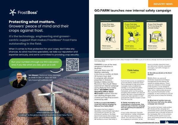 FARMING is one of the most dangerous industries in Australia . Last year there were 32 fatalities nationally . In the first six months of 2024 , 30 farmers have died . A company with almond properties in Victoria ’ s Goulburn Valley and the Riverina in New South Wales launched an internal campaign during National Farm Safety Week . GO . FARM ’ s Chief Operating Officer Greer McCracken explains how the eye-catching designs were created and how they ’ ve been received by staff .