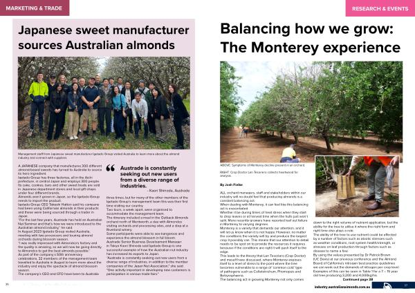 ALL orchard managers , staff and stakeholders within our industry will no doubt feel that producing almonds is a constant balancing act . When dealing with Monterey , it can feel like this balancing act is exacerbated . Whether it be during times of heat stress when they start to drop leaves or at harvest time when the hulls just won ’ t split . More recently growers have reported leaf out failure in Monterey to varying degrees . Monterey is a variety that demands our attention , and it will let us know when it is not happy . However , no matter the conditions the variety will try and produce the largest crop it possibly can . This means that our attention to detail needs to be spot on to provide the resources it requires because if the conditions are right it will push itself to the edge . This leads to the theory that Len Tesoriero ( Crop Doctor ) and myself have discussed , where Monterey exposes itself to a level of stress to the point where the tree becomes vulnerable to a range of ‘ common cold ’ type of pathogens such as Colletotrichum , Phomopsis and Botryosphaeria . The balancing act in growing Monterey not only comes down to the right volume of nutrient application , but the ability for the tree to utilise it where the right form and right time also plays a role . The ability of the tree to use nutrient could be affected by a number of factors such as abiotic stresses such as weather conditions , root system health / strength , or stresses on leaf production through factors such as disease to name a few . By using the values presented by Dr Patrick Brown ( UC Davis ) at our previous conference and the Almond Board of California ’ s nitrogen best practice guidelines we can work out the demands of nitrogen per crop level . Examples of this can be seen in Table 1 for a 7 – 15 year old tree producing 3,200 and 4,000kg / ha .