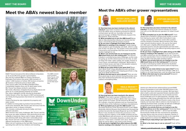 Q . How long have you been involved in the almond industry ? I have been involved in the almond industry since the 1970s since my family purchased an almond orchard which we still run . Currently I am now the general manager of Walker Flat Almonds , based in the Murraylands , South Australia . Q . What prompted you to join the ABA board ? Being able to help develop the industry as it moves into the future , and working with the people involved . Q . Do you have a highlight from either being on the ABA board or working in the industry ? I enjoy helping other people to gain knowledge and skills , which is a big part of why I do what I do . The people I have met and the connections and friendships that have been formed are another highlight for me . Q . What ’ s one priority that you are hoping to see the ABA board focus on in the coming year ? The almond industry is currently facing many challenges , as the costs are going up and the almond prices are at a low , as well as things like water , water quality , tree quality , disease & insect issues , and pollination challenges . Being able to work on these issues and help to find possible solutions is something I like working towards . Q . What do you enjoy doing in your spare time ? Spare time ? What ’ s that ? I enjoy spending time with my family – things like getting together and enjoying good food is a big part of our family and friend life . Q . What is the best way to eat an almond ? There are only three great ways to eat an almond . During December once they have hardened but before the skin goes brown ; dry roasted ; and anything toffee .
