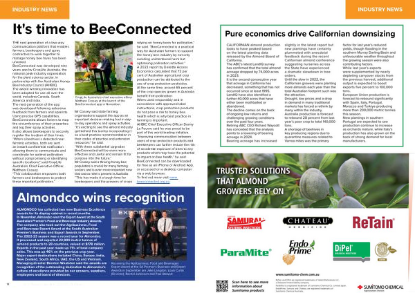 CALIFORNIAN almond production looks to have peaked based on the latest planting data released by the Almond Board of California . The ABC ’ s latest LandIQ survey has confirmed that the total almond acreage dropped by 74,000 acres in 2023 . It is the second consecutive year that acreage in California has decreased , something that has not occurred since at least 1995 . LandIQ have also identified a further 40,000 acres that have either been mothballed or abandoned . The decline comes on the back of ongoing low returns and challenging growing conditions over the past four years . Retiring ABC CEO Richard Waycott has conceded that the analysis points to a lowering of bearing acreage in 2024 . Bearing acreage has increased slightly in the latest report but new plantings have certainly plummeted with anecdotal feedback during the recent Californian almond conference suggesting nurseries across the State have experienced a dramatic slowdown in tree orders . Until the slow in 2022 , the Californian growers were planting more almonds each year than the total Australian footprint such was the attraction . Drought , low prices and a drop in demand in many traditional markets has forced a rethink by many within the industry . Australia production is forecast to rebound 28 percent from last year ’ s poor crop to total 140,000 tons . A shortage of beehives in key producing regions due to quarantine measures related to Varroa mites was the primary factor for last year ’ s reduced yields , though flooding in the southern Murray Darling Basin and unfavourable weather throughout the growing season were also contributing factors . While last year ’ s exports were supplemented by nearly depleting carryover stocks from the previous harvest , additional output is expected to boost exports five percent to 100,000 tons . European Union production is forecast to rebound significantly with Spain , Italy , Portugal , Morocco and Turkiye producing more than 200,000 metric tonnes this season . New plantings in southern Portugal are expected to see production continue to increase as orchards mature , while Italy ’ s production has also grown on the back of strong demand for local manufacturers .