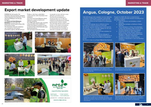 DURING the last quarter , the Australian almond industry exhibited at two important fine food fairs : Food and Hotel Malaysia and Anuga , Cologne . The Food and Hotel Malaysia Exhibition ran from 19 to 22 September at the Kuala Lumpur ( KL ) Convention Center The Australian almonds exhibition was assisted by a KL-based promotions agency , All About Fresh