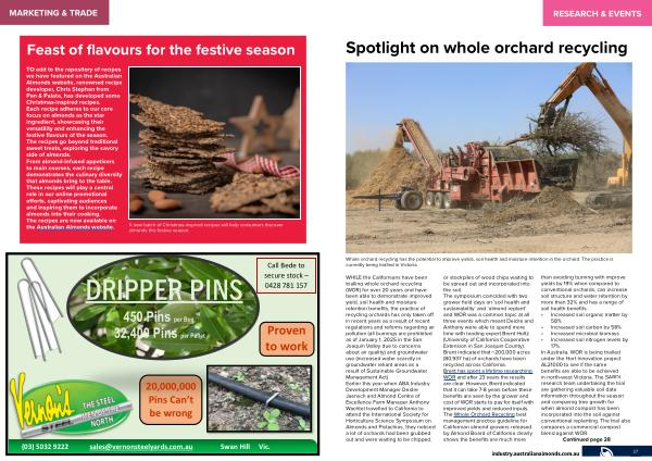 WHILE the Californians have been trialling whole orchard recycling ( WOR ) for over 20 years and have been able to demonstrate improved yield , soil health and moisture retention benefits , the practice of recycling orchards has only taken off in recent years as a result of recent regulations and reforms regarding air pollution ( all burnings are prohibited as of January 1 , 2025 in the San Joaquin Valley due to concerns about air quality ) and groundwater use ( increased water scarcity in groundwater reliant areas as a result of Sustainable Groundwater Management Act ). Earlier this year when ABA Industry Development Manager Deidre Jaensch and Almond Centre of Excellence Farm Manager Anthony Wachtel travelled to California to attend the International Society for Horticulture Science Symposium on Almonds and Pistachios , they noticed a lot of orchards had been grubbed out and were waiting to be chipped , or stockpiles of wood chips waiting to be spread out and incorporated into the soil . The symposium coincided with two grower field days on ‘ soil health and sustainability ’ and ‘ almond replant ’ and WOR was a common topic at all three events which meant Deidre and Anthony were able to spend more time with leading expert Brent Holtz ( University of California Cooperative Extension in San Joaquin County ). Brent indicated that ~ 200,000 acres ( 80,937 ha ) of orchards have been recycled across California . Brent has spent a lifetime researching WOR and after 23 years the results are clear . However , Brent indicated that it can take 7-8 years before these benefits are seen by the grower and cost of WOR starts to pay for itself with improved yields and reduced inputs . The Whole Orchard Recycling best management practice guideline for Californian almond growers released by Almond Board of California clearly shows the benefits are much more than avoiding burning with improve yields by 19 % when compared to conventional orchards , can increase soil structure and water retention by more than 32 % and has a range of soil health benefits :