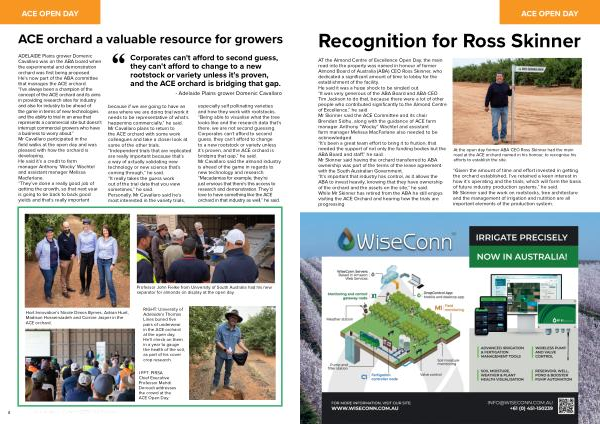 ADELAIDE Plains grower Domenic Cavallaro was on the ABA board when the experimental and demonstration orchard was first being proposed . He ' s now part of the ABA committee that manages the ACE orchard . “ I ’ ve always been a champion of the concept of the ACE orchard and its aims in providing research sites for industry and also for industry to be ahead of the game in terms of new technologies and the ability to trial in an area that represents a commercial site but doesn ’ t interrupt commercial growers who have a business to worry about .” Mr Cavallaro participated in the field walks at the open day and was pleased with how the orchard is developing . He said it ’ s a credit to farm manager Anthony ‘ Wocky ’ Wachtel and assistant manager Melissa Macfarlane . “ They ’ ve done a really good job of getting the growth , so that next year is going to be back to back good yields and that ’ s really important