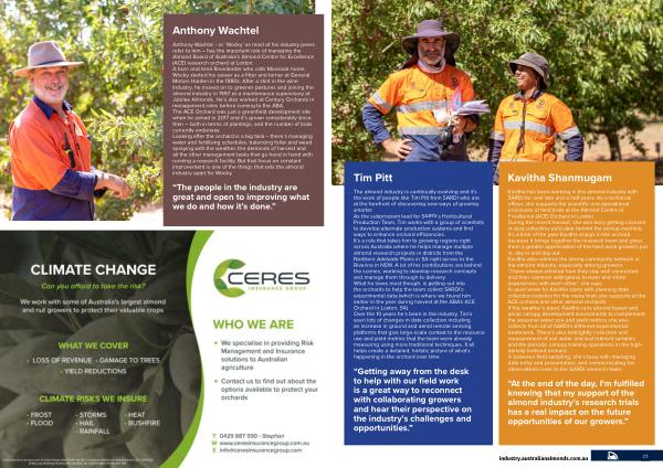 Anthony Wachtel - or ‘ Wocky ’ as most of his industry peers refer to him – has the important role of managing the Almond Board of Australia ’ s Almond Centre for Excellence ( ACE ) research orchard at Loxton . A born and bred Riverlander who calls Moorook home , Wocky started his career as a fitter and turner at General Motors Holden in the 1980s . After a stint in the wine industry , he moved on to greener pastures and joining the almond industry in 1997 as a maintenance supervisory at Jubilee Almonds . He ’ s also worked at Century Orchards in management roles before coming to the ABA . The ACE Orchard was just a greenfield development site when he joined in 2017 and it ’ s grown considerably since then – both in terms of plantings , and the number of trials currently underway . Looking after the orchard is a big task – there ’ s managing water and fertilising schedules , balancing foliar and weed spraying with the weather , the demands of harvest and all the other management tasks that go hand in hand with running a research facility . But that focus on constant improvement is one of the things that sets the almond industry apart for Wocky .