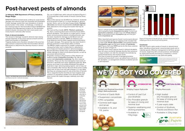 INFESTATIONS of orchard pests continue to cause kernel damage once almond crops are harvested and stockpiled . Further damage results from new infestations of stored product pests . In this article , Jo Holloway , a member of the research team for Hort Innovation Project AL16009 ‘ An Integrated Pest Management program for the Australian almond industry ’ discusses the main insect pests commonly found in almonds after harvest .